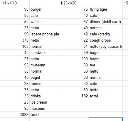 I track my weekly expenses in google sheets. This is what some of the weeks look like. As you can see, the first week I went over my goal of 825 DKK/week by quite a bit, which I expected considering the preliminary things I wanted to buy and the meals I initially ate out at restaurants. It can be helpful to break it down further and see how much you’re spending on groceries vs. excursions.