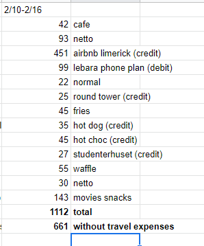 My last weekend was very fun, but was also on the higher end of my budget, and I want to talk about what I enjoyed and why it was worth it for me. And then I want to talk about how I take both the fun and mundane aspects of my life and try to finance them. This is not advice, because 1) I am not doing a great job at it and 2) the decisions I make are dependent on my own situation and priorities. But hopefully sharing this aspect of my abroad experience will give one example of how spending can work while in Copenhagen.