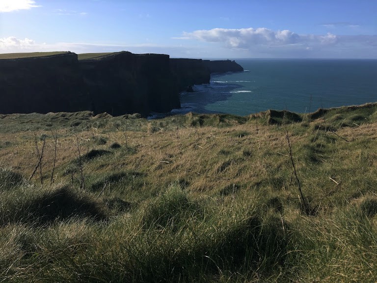On Thursday, I woke up early and walked through Limerick as it was just waking up, yellow-rosy above closed bars and church steeples. I caught an 8:30 bus out to Ennis first, passing by the rest of the countryside through the middle of Ireland and the Bunratty Castle. At the Ennis bus station, I got tea from the cart and waited for my next bus, the 350 bus to Galway, which took me up along the west coast. The flat open roads soon turned twisty-curvy, and this bus driver drove like a madman as they opened into soft hills covered with long grass, and went up eventually to the sea. I got off at the Cliffs of Moher and walked up to the lookout point by the tower first. All words have already been used to describe the views here but they are all true. In a miracle, the sun was out and the temperature mild, so you could see the long line of dark cliffs edging out, one after another, into the cerulean blue that thrashed into froth at the rocks, and occasionally the wind would catch this water and bring light sea mist up over the cliff edges where the white gulls were circling. I walked on the path southwards towards Hags Head, stood up on a grassy cliff alone, and then walked back, for a quick sandwich at the visitor center before my next bus out.